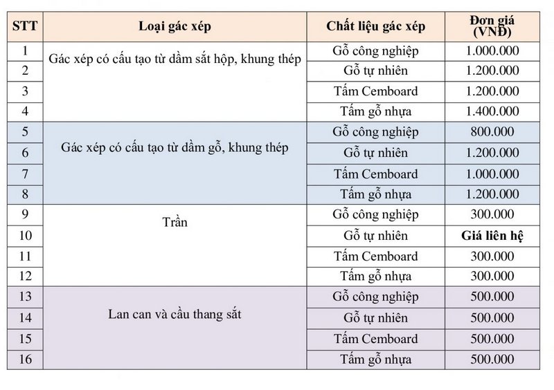 Bảng báo giá dịch vụ thiết kế và thi công gác xép trọn gói tại Hoàng Anh có sự thay đổi phụ thuộc vào vật giá nguyên liệu trên thị trường. Đồng thời, yếu tố giá thành phụ thuộc vào nhiều điều kiện khác nhau như: